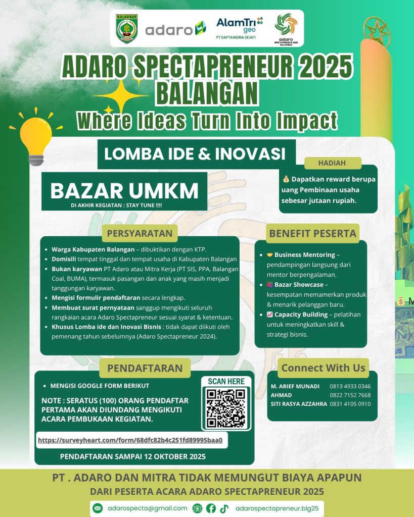 “Kami ingin membuka ruang bagi masyarakat Balangan untuk menyalurkan ide dan inovasi yang bisa menjadi solusi sekaligus peluang usaha baru. Adaro Spectapreneur adalah bukti nyata dukungan kami terhadap pengembangan ekonomi lokal,” ujar Ahmad Fahreza, Ketua panitia Adaro Spectapreneur 2025, Selasa (7/10/2025).