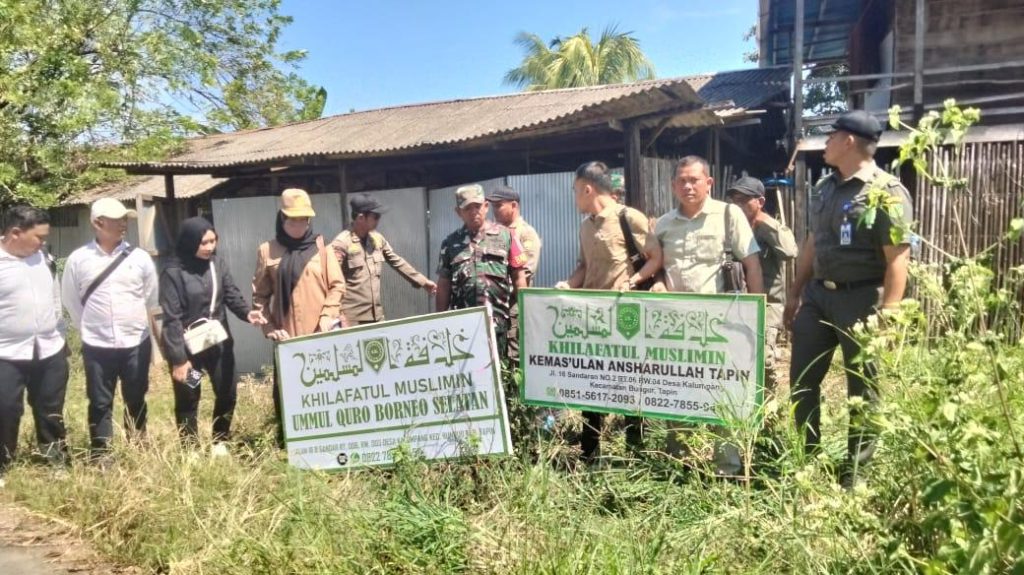 TAPIN – Aksi tegas akhirnya diambil aparat gabungan terhadap keberadaan simbol organisasi terlarang Khilafatul Muslimin di Desa Kalumpang, Kecamatan Bungur. Papan nama bertuliskan “Khilafatul Muslimin” yang terpajang di depan rumah salah satu tokohnya, resmi diturunkan paksa, Senin (28/7).